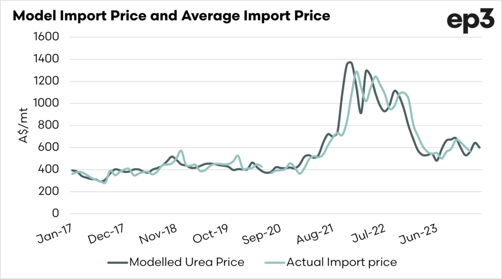 The thing everyone cares about is the cost of urea. The second chart shows our modelled import urea price (darker colour) to the end of March, and we also have the actual average import price.