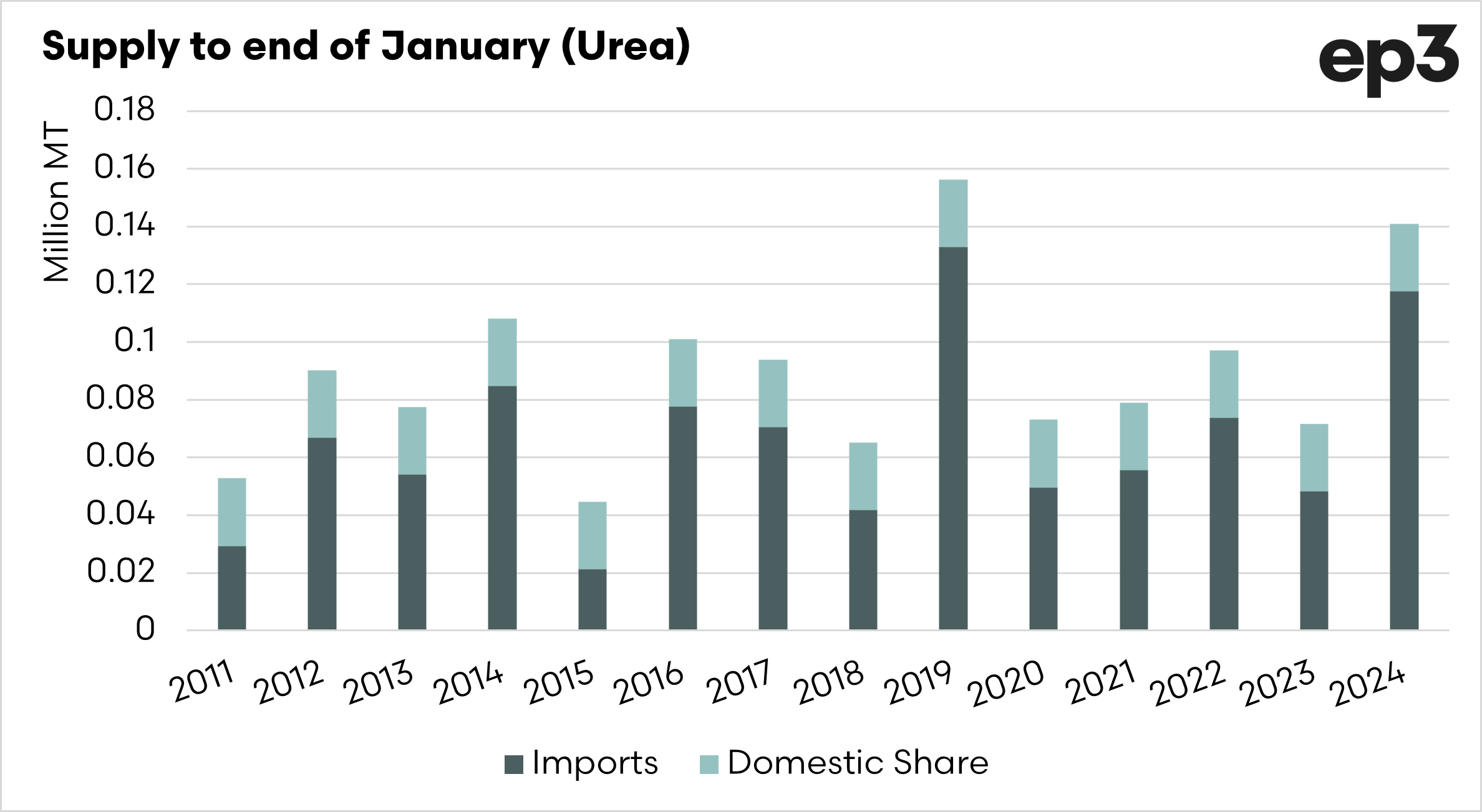 The first chart shows the imports for January, going back to 2011. The light blue part of the bar is a theoretical volume which would have come from the mothballed Gibson Island urea plant. This is to give an indication of overall supply (imports and domestic).