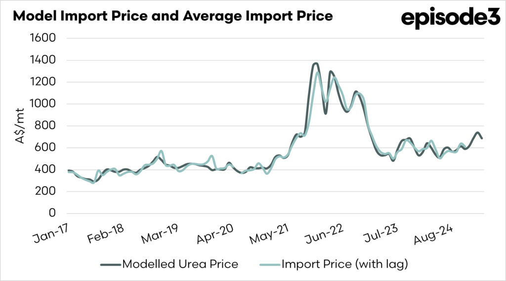 We take the price of urea at the origin, add freight to Australia, and an unloading cost. This gives us an indication of the cost of getting urea to Australia, it is important to note that this is not a delivered price. On this website, we provide this on a monthly basis publicly and more regularly to our private clients.
