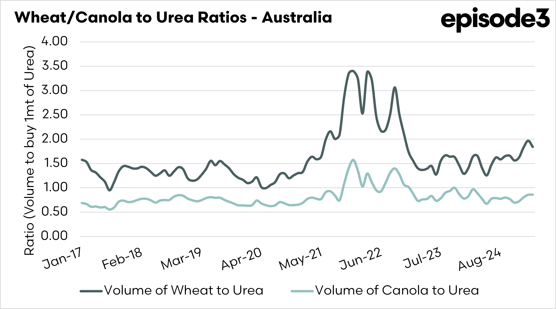 The second chart shows the urea affordability ratio. This shows how much grain you need to sell to buy a tonne of urea. Urea remains affordable compared to canola, but in recent times, price declines have seen affordability drop in wheat, although with a slight improvement in March.