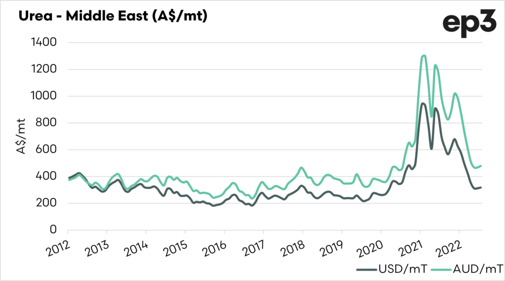 The first chart below shows the Urea price in the middle east (our dominant supplier), in both USD and AUD. Have they fallen in your area? If so let us know here