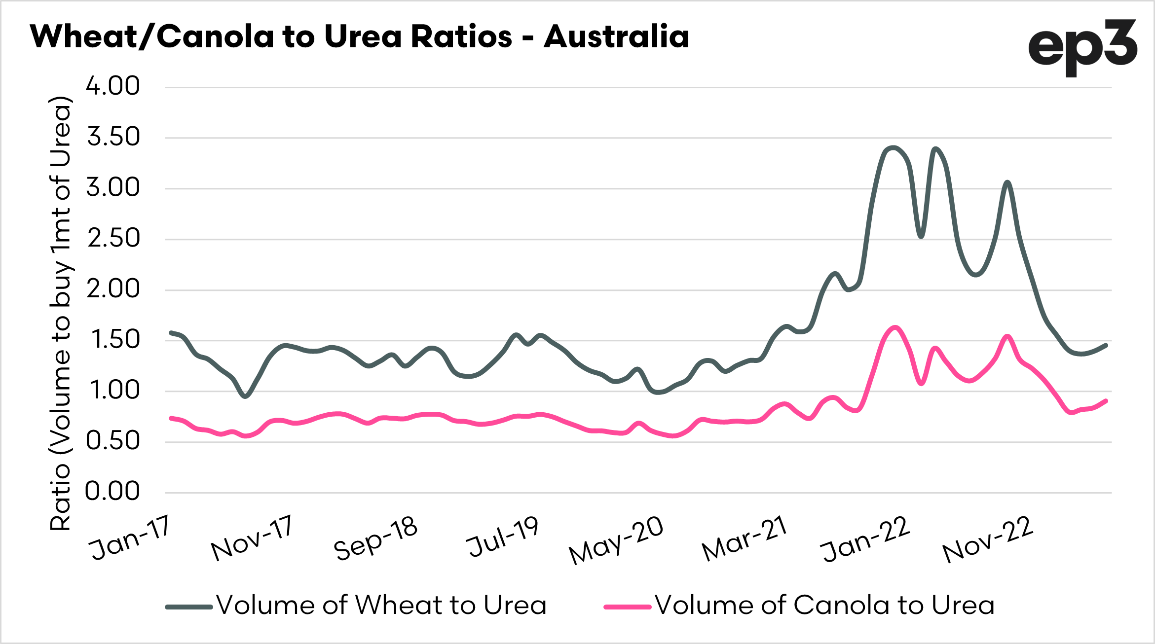 - The affordability of urea versus canola/wheat has dropped – albeit only fractionally.