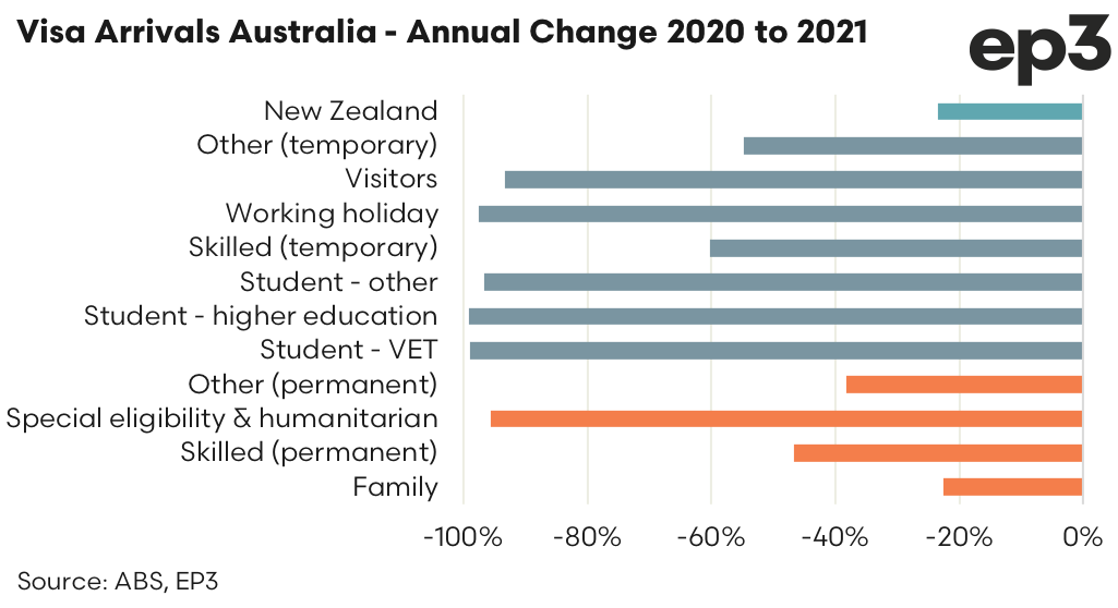 Skilled temporary visa entrants were down 60% from 2020 to 2021 and skilled permanent visa arrivals declined by 47% over the same time horizon.