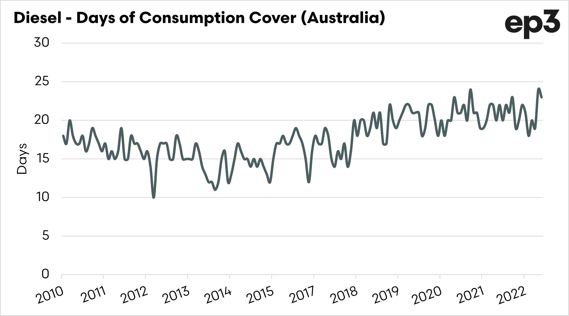 The chart below shows how many days of consumption Australia has on hand, with the most updated month being November.