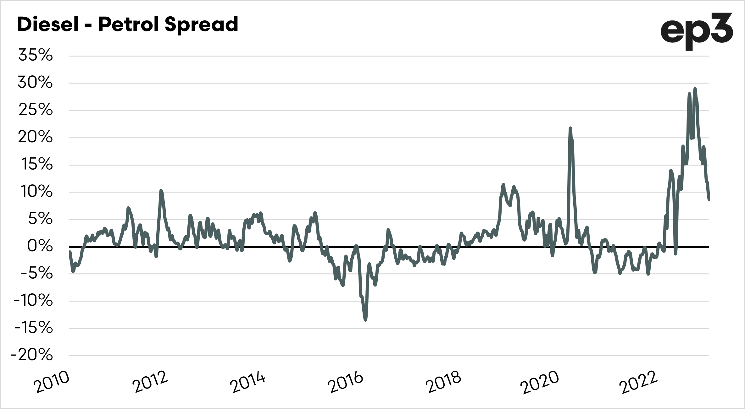 Let’s look at that spread below. In recent times, Australia has seen diesel move to a premium of 30% over petrol. Luckily it has started breaking back down towards more normal levels, at a current premium of 9%.