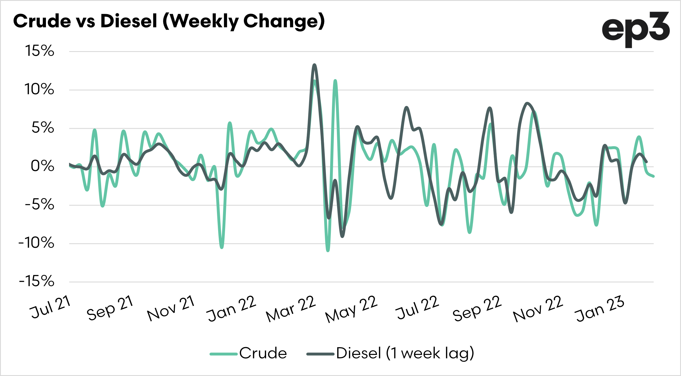 The chart below shows the change in price on a weekly basis between the crude oil price, and the cost of diesel at the terminal.