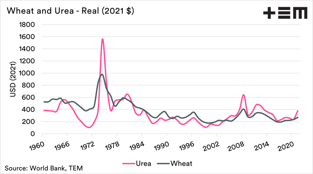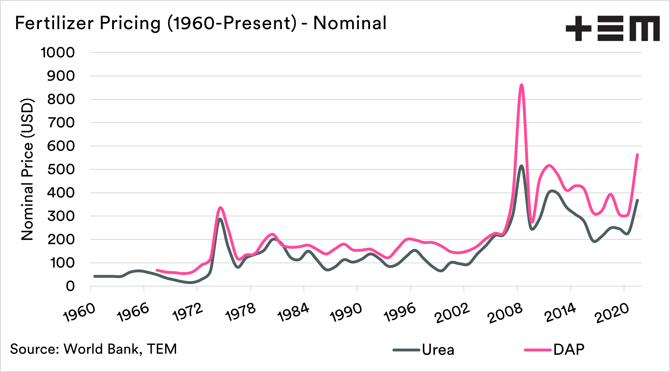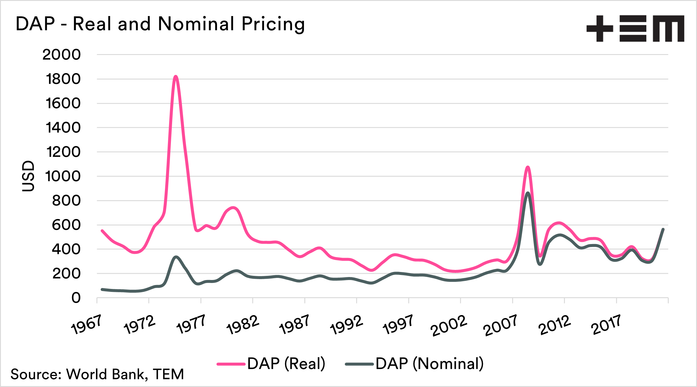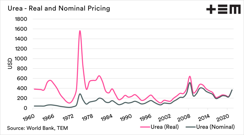 The first chart below shows the nominal price of fertiliser from the 1960s to the present. This is annualised data and shows that fertiliser pricing is starting to head towards the heady prices of the mid-2000s. This data doesn’t take into account inflation.