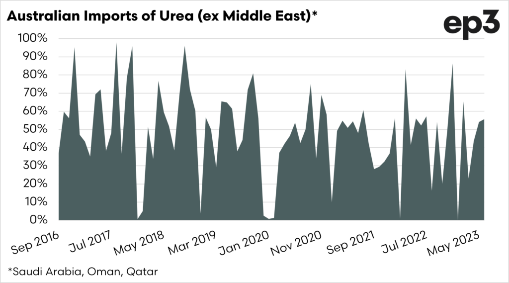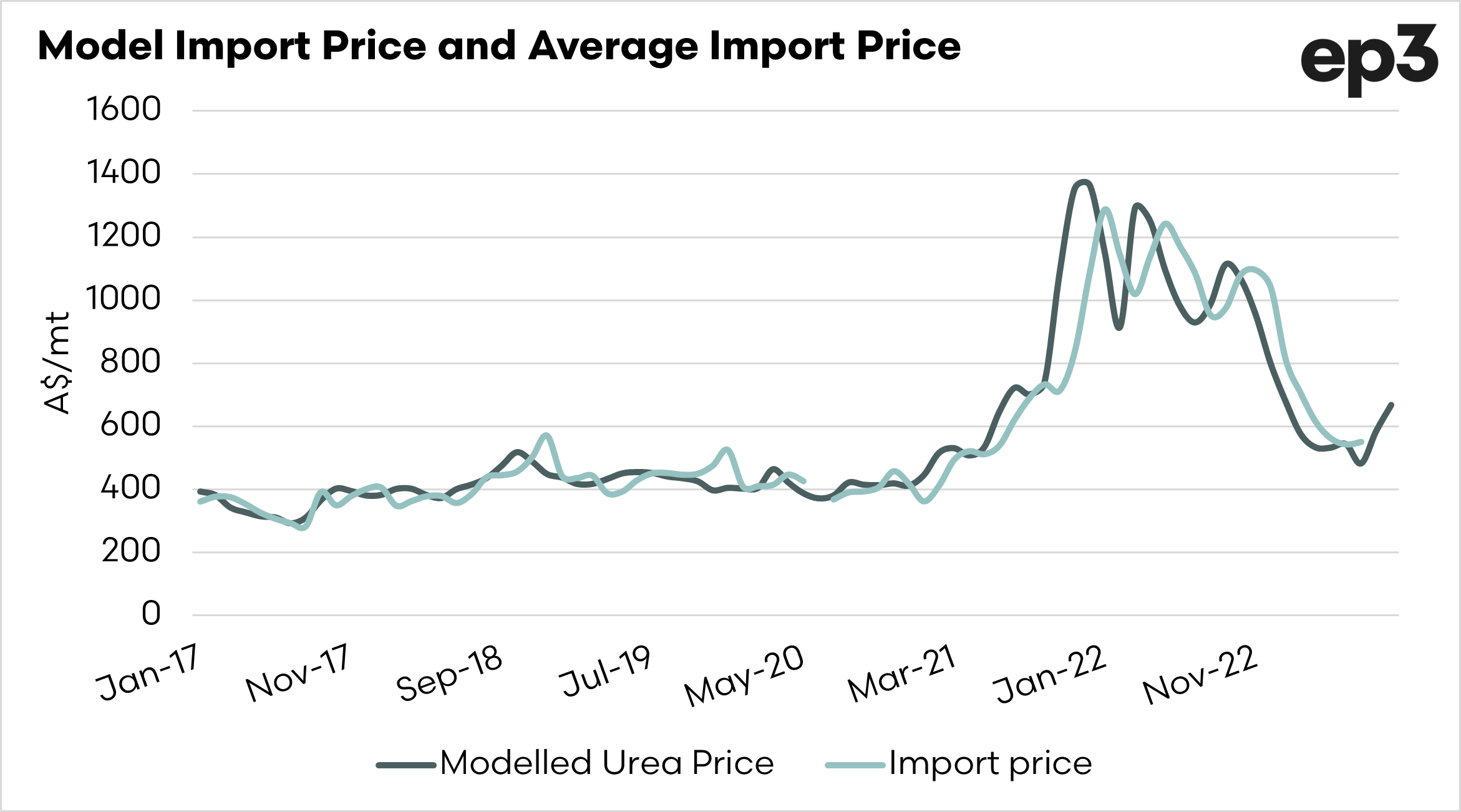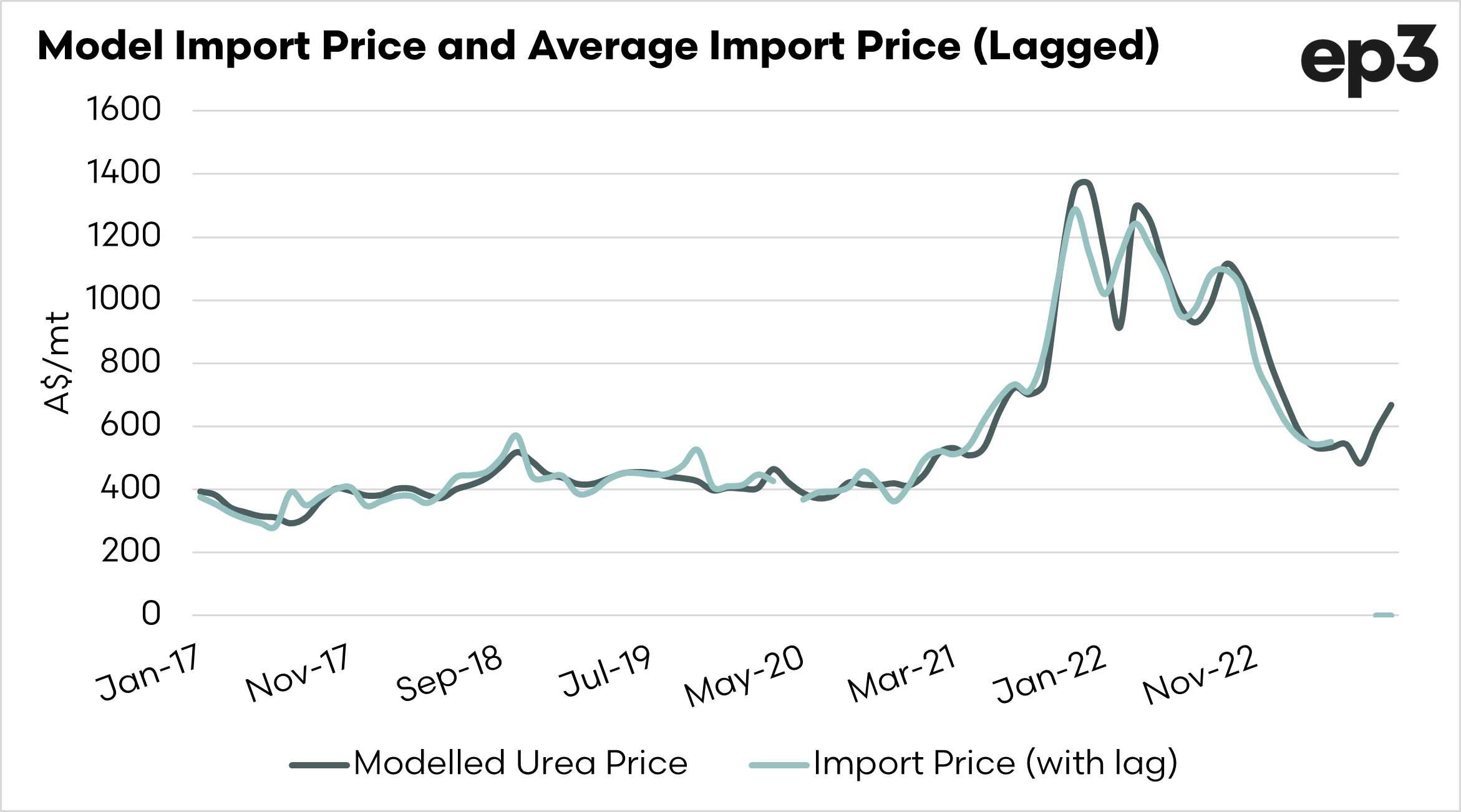 In the absence of anything better, our modelled urea price provides a solid indicator of the cost of importing urea into Australia; this is especially the case when we consider a three-month lag.