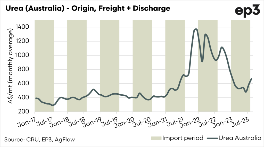 - In the absence of transparent and publicly quoted pricing, our model provides a good insight into the cost of urea landed in Australia.