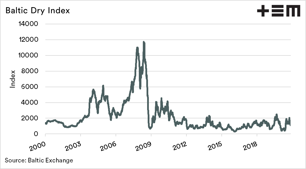 First and foremost the BDI is an indicator of the cost of shipping bulk commodities. In Australia, we export a large volume of bulk materials, from grains to ore. Therefore the cost of freight is an important factor in our trade.