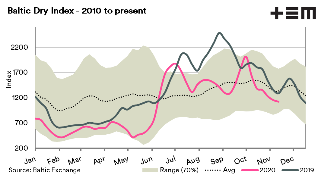 The Baltic Dry Index rose strongly during September/October; it has subsequently capsized losing all the gains and returning to the levels at the height of the first wave of COVID-19. This lower freight rate helps Australian grain reach destinations further away, which is beneficial in a year with large surplus stocks.