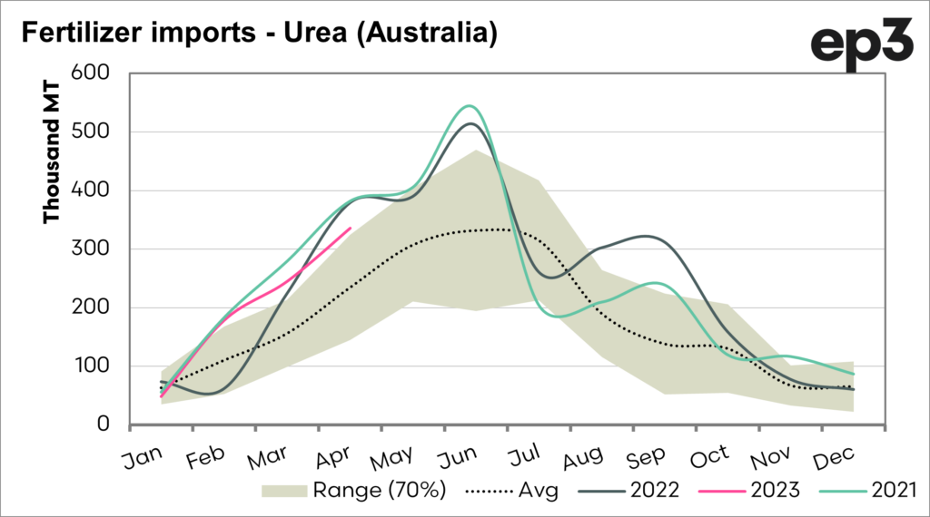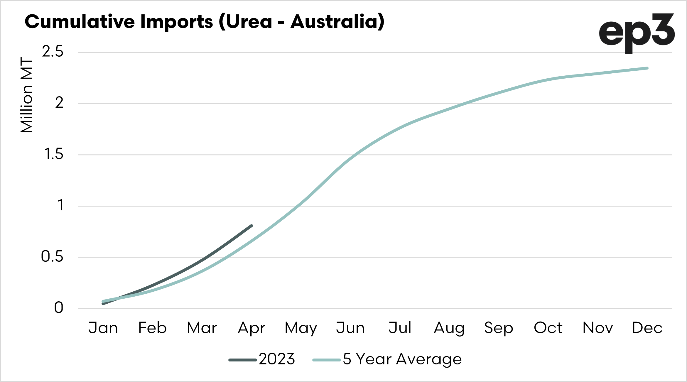 This can be seen below in the chart, which shows the cumulative urea imports for this year versus the five-year average. So up until April, we were ahead of the curve on imports. Does this mean we will run out of urea?