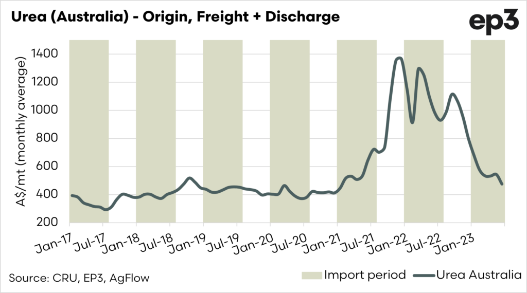 This was in place of any transparent pricing available to the marketplace. We can see now that fertilizer prices landed in Australia have fallen to their lowest levels since January 2021. At these levels, we don’t foresee significant further falls.