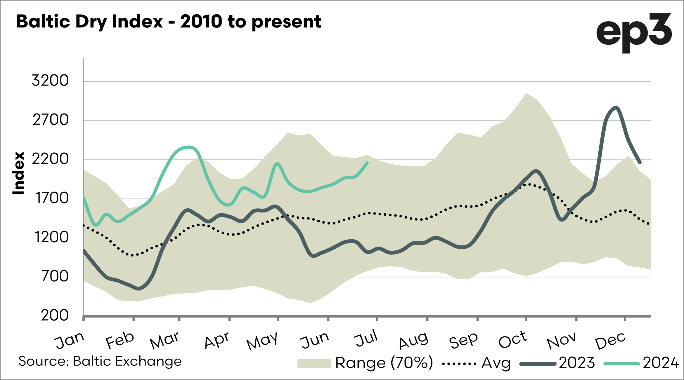 The dry bulk market is significant as it is fundamental to our exports of grains and our imports of fertilizer. The Baltic Dry Index (BDI) is an important indicator of bulk freight rates. The BDI has been stronger throughout 2024.