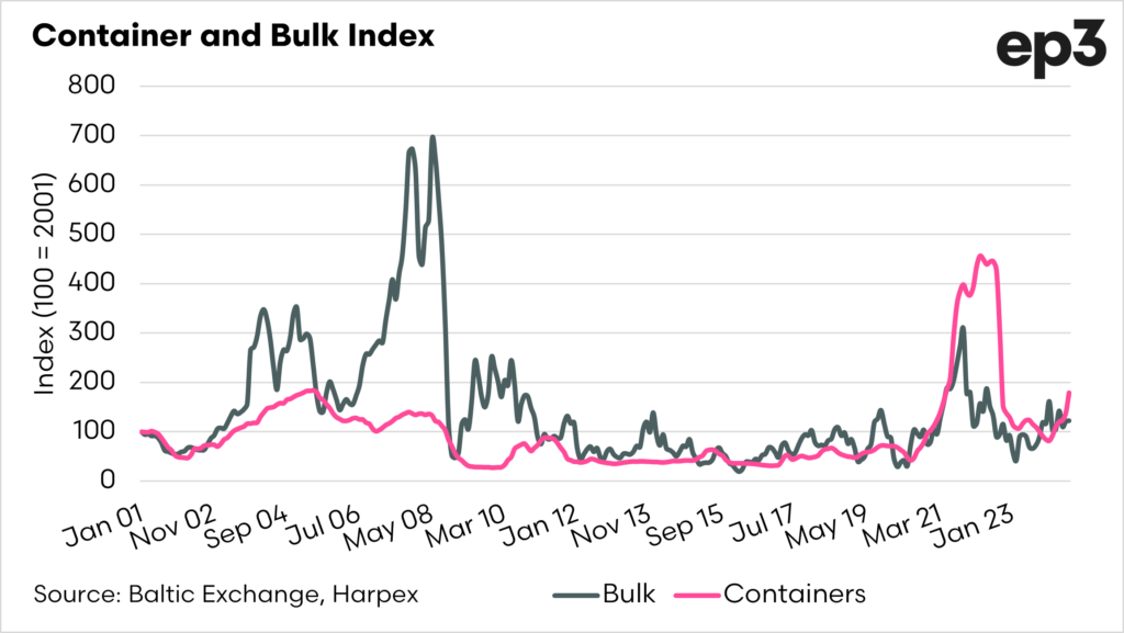 The first chart below shows an index of bulk vs container pricing from 2001 to the present; both indexes have been rebased to Jan 01 (100). Containers follow some of the trend movements of bulk. When global growth increases, then containers rise due to demand.