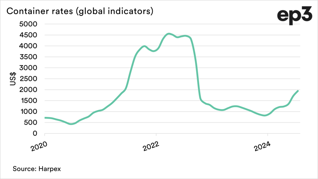 The second chart below shows containers’ cost from 2020 to the present. This year, the cost of container freight increased strongly. Partly, this was due to the Houthi red sea attacks. We are still a long way from the recent highs caused during the height of the COVID pandemic, but it is a worrying trend at a time of high inflation.