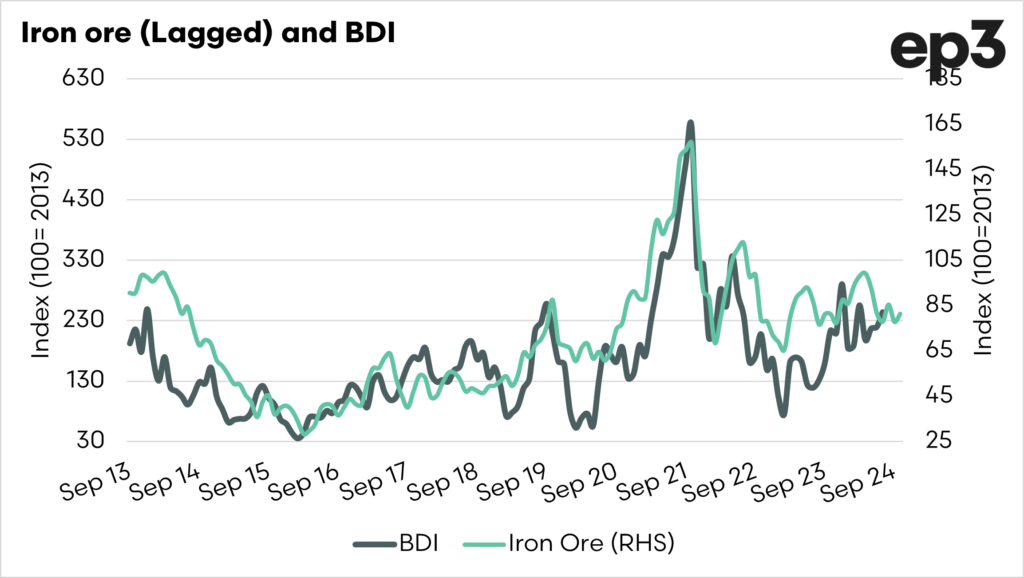 This is important as the BDI (and potentially ore) has a secondary role as a lead economic indicator. A higher BDI is considered by many to be a proxy for global growth, as bulk carriers transport the underlying commodities required for the production of, well, everything.