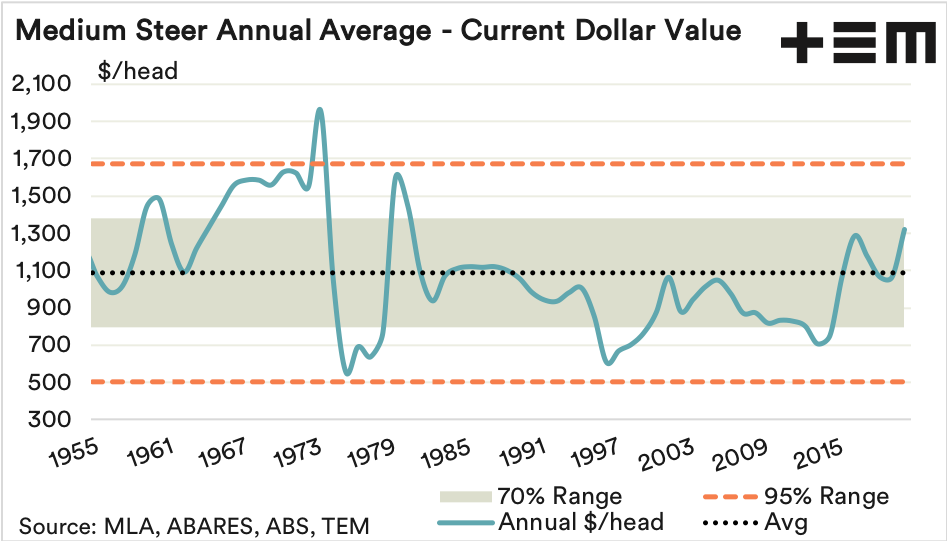 Based on the 2020 annual average price of 330c/kg lwt for a 400 kg live weight medium steer the price per head is around the $1,320 level. Historically, in real terms, this price has fluctuated between $800 and $1,380 for 70% of the time since the early 1950s and has set a long term average of $1,090 per head. Prices below $500 or above $1,680 per head would be considered extreme (beyond the 95% boundary) for this type of steer as they have occurred less than 5% of the time over the last seven decades.