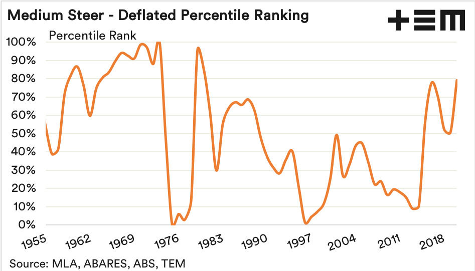 Another way to assess the current price of Aussie cattle compared to historic levels is via a percentile ranking of the annual average price, after all prices have been converted to 2020 dollar values. The percentile ranking chart shows how volatile the mid 1970s were with prices moving from the highest they had ever been in real terms (100th percentile in 1973) to the lowest they had ever been (zero percentile in 1975) then back to the 96th percentile in 1979.