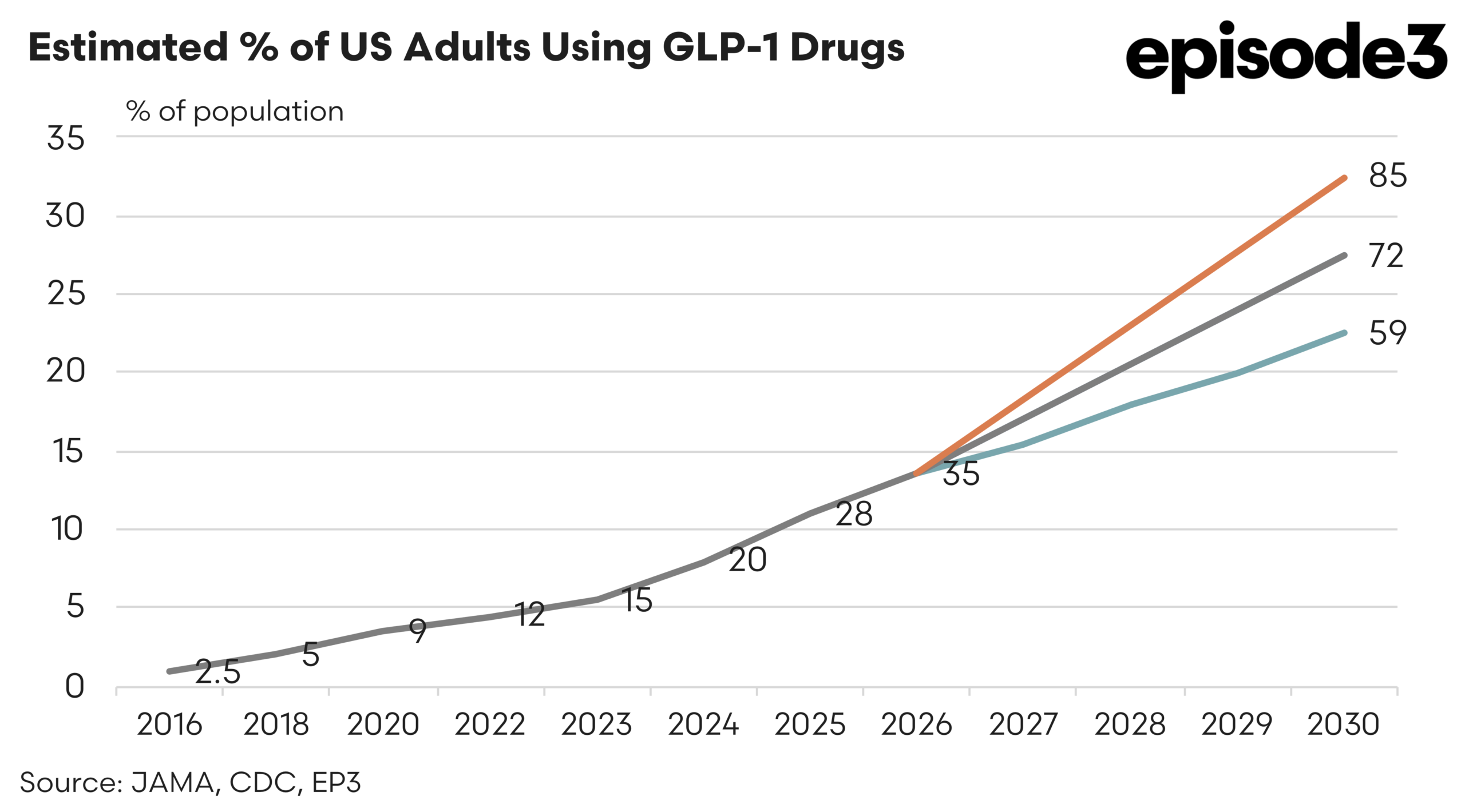 Estimates suggest that by the end of the decade somewhere between 59 million and 85 million US consumers could be using these drugs. That is not a marginal cohort, it would be between 22-32% of the adult US population. That is a structural shift in how a large share of the population interacts with food.