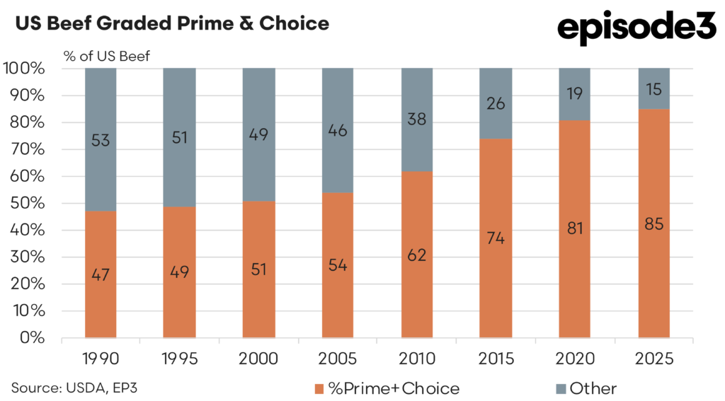 As the chart below shows, Choice and Prime now account for around 85 percent of US beef production, up from less than 50pc in the early 1990s. At the same time, Wagyu systems in both the US and Australia have been pushing further up the marbling curve, with a growing share of carcasses grading 7MS and above.