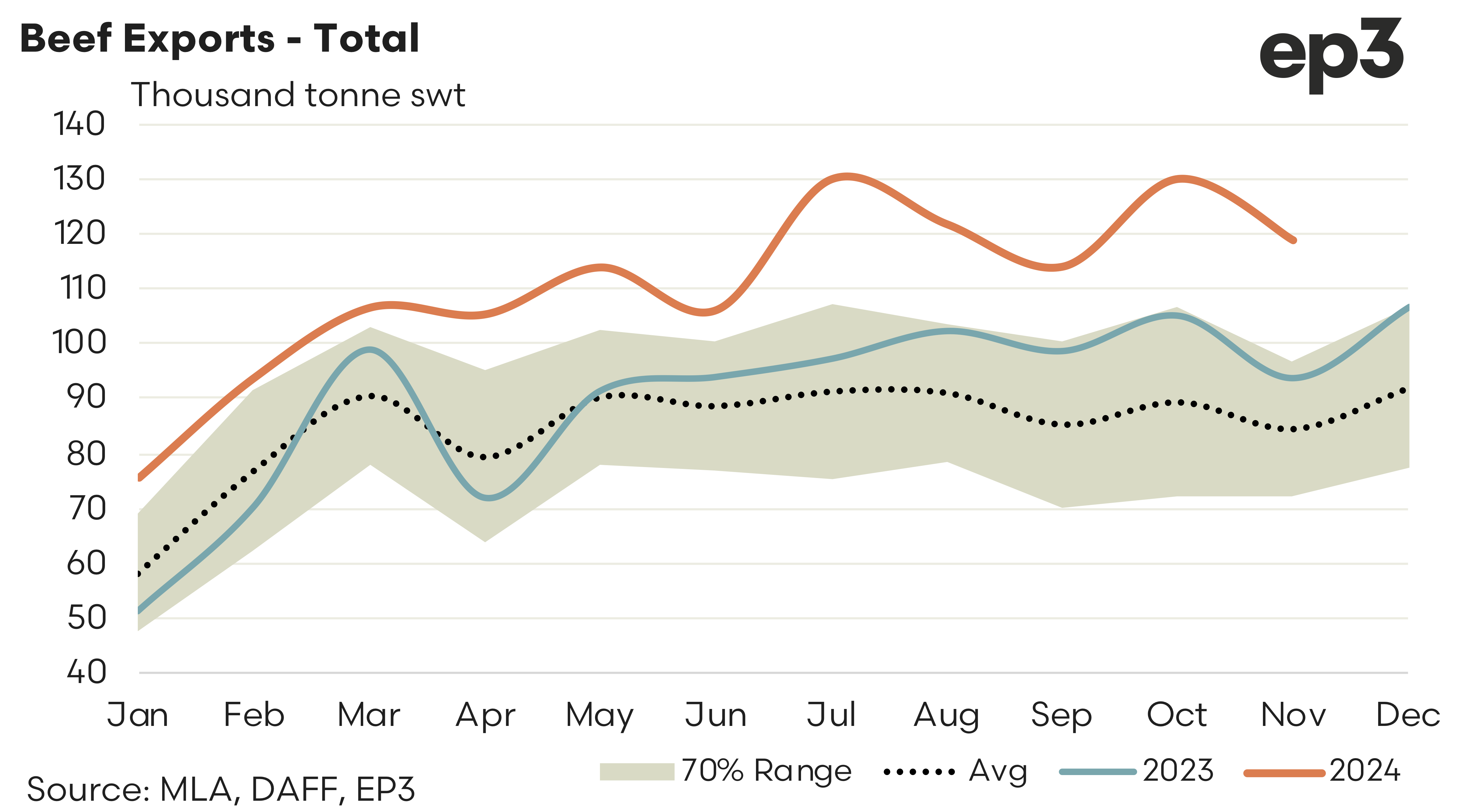 Year-to-date exports have now reached 1.216 million tonnes, up a significant 25% or 241,000 tonnes higher when compared to the same time period in 2023. With only December remaining, the 2024 export volume is poised to surpass previous records of 1.22 million and 1.23 million tonnes, set in 2015 and 2016 during the drought-driven cattle turnoff.