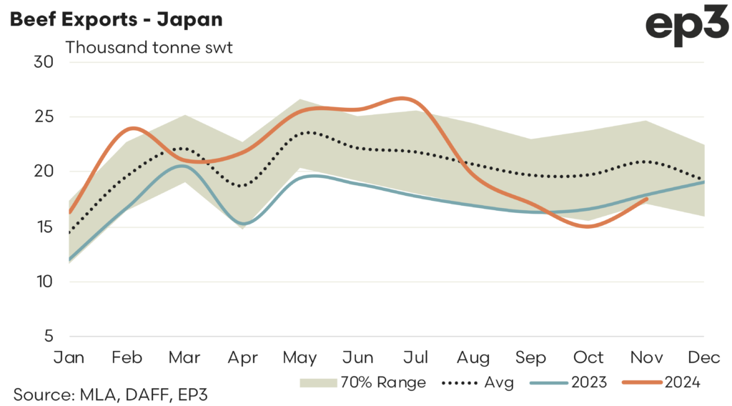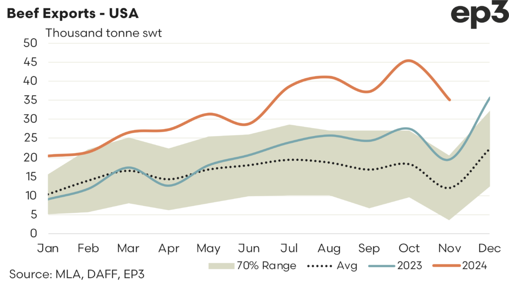 USA – There was a 23% drop in beef export flows to the USA from Australia during November to see 35,026 tonnes shipped over the month. As the seasonal average trend identifies it is not uncommon to see a drop in US demand for beef from Australia in November some years and it is not something to be too concerned by as an Aussie beef producer or exporter as the demand from the USA will remain firm into 2025 given their supply picture. The USA has imported 352,440 tonnes of Australian beef so far this year, up an extraordinary 68% or 142,000 tonnes on 2023. Declining US herd numbers, reduced beef production/cold stores and high cattle/beef prices are driving demand for offshore alternatives.