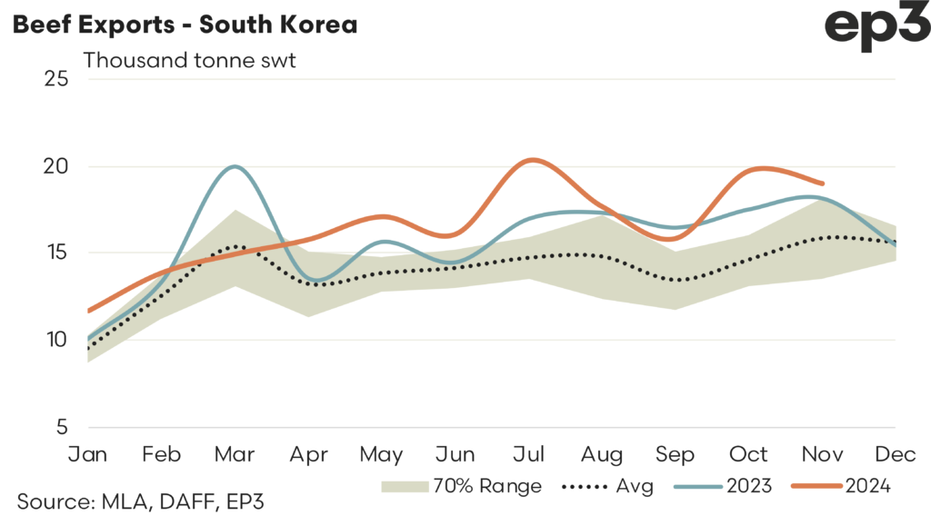 South Korea – November exports reached 19,001 tonnes, slightly below October’s volumes but still 5% higher than November 2023. Compared to the five-year average for November the beef trade to South Korea currently sits 20% higher and on a year-to-date basis, South Korea has taken 182,000 tonnes, which is a 5% increase on last year.