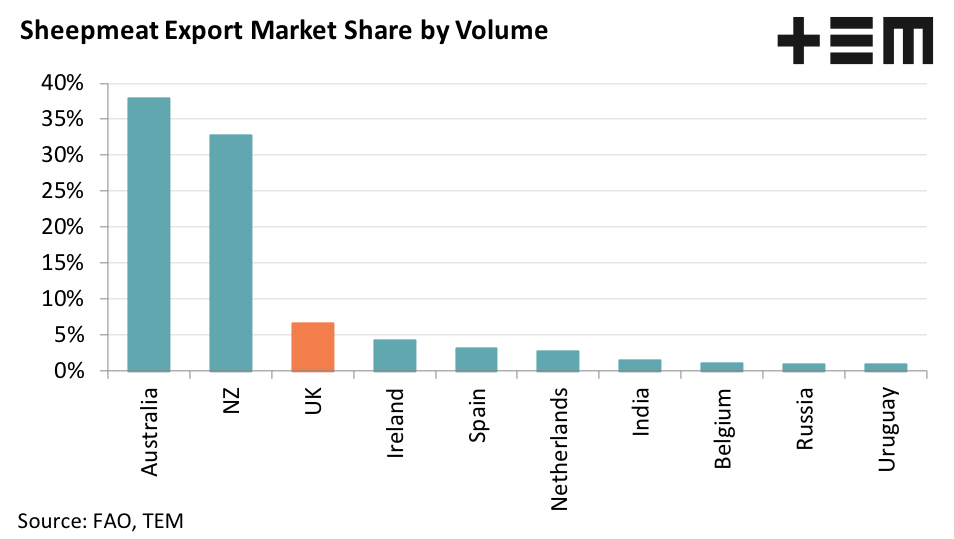 Analysis of the proportion of the global sheep meat trade shows that Australia and NZ dominate the export market share, with the UK holding third position in export volumes at around 7% of the share of trade. In 2020 the UK produced about 300,000 tonnes of sheepmeat and exported 88,000 tonnes.