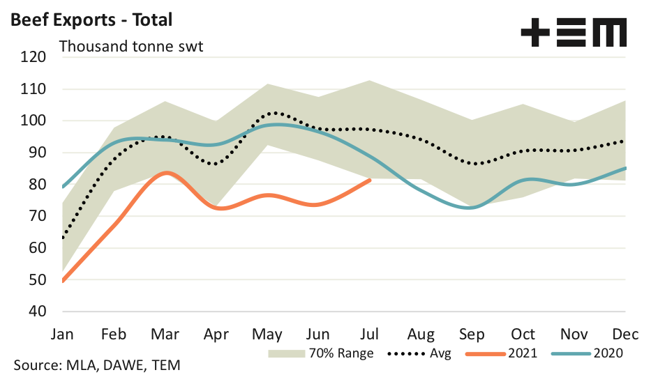 Total beef export volumes for July managed to hit the second highest monthly tally this year at 81,171 tonnes swt, after posting a 10% gain on the June beef export figures. However, despite the month on month lift, total beef exports remain below the normal fluctuation in trade volumes that could be expected during this time in the season, according to the 70% range*, and the July 2021 figures represent beef trade volumes that are nearly 17% below the five-year trend for July.