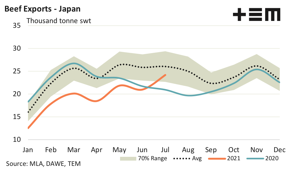 - Australian beef consignments to Japan in July hit 24,199 tonnes swt, which are the largest monthly flows since November 2020.