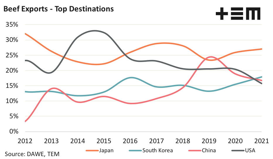 - China is managing to hold onto the bronze medal place, in terms of market share of total Australian beef exports for 2021, with 16% of the total beef export flows.