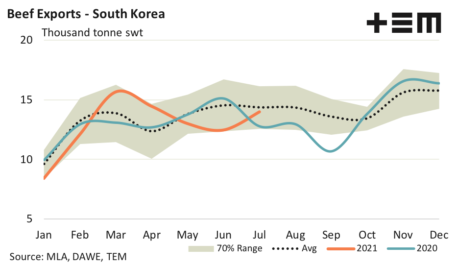 - Beef export flows to South Korea managed a 12% lift in volumes from June to July to see 14,006 tonnes swt reported, a meagre 2% under the five-year average for July.