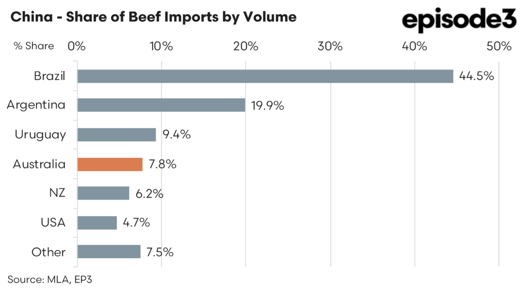 China is the largest destination for global beef exports, but it is also a highly segmented market. While Brazil holds the largest overall share of beef imports into China at around 45 per cent, it tends to supply the volume end of the market, with its product mostly destined for lower-value processing channels or more price-sensitive inland cities.