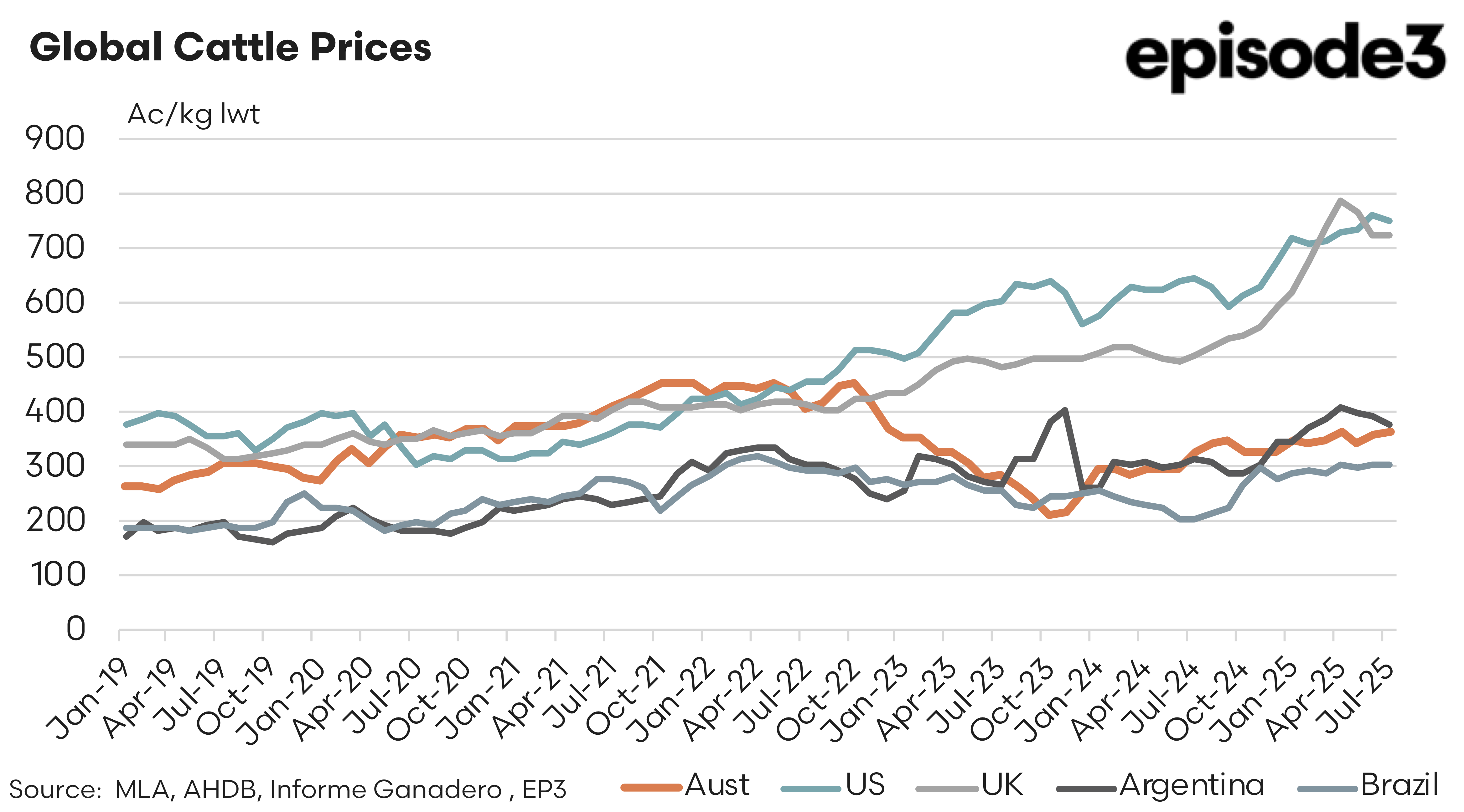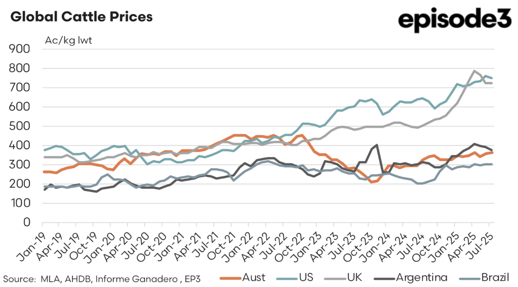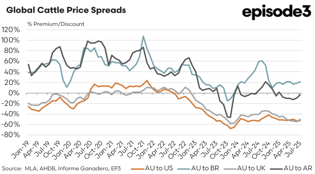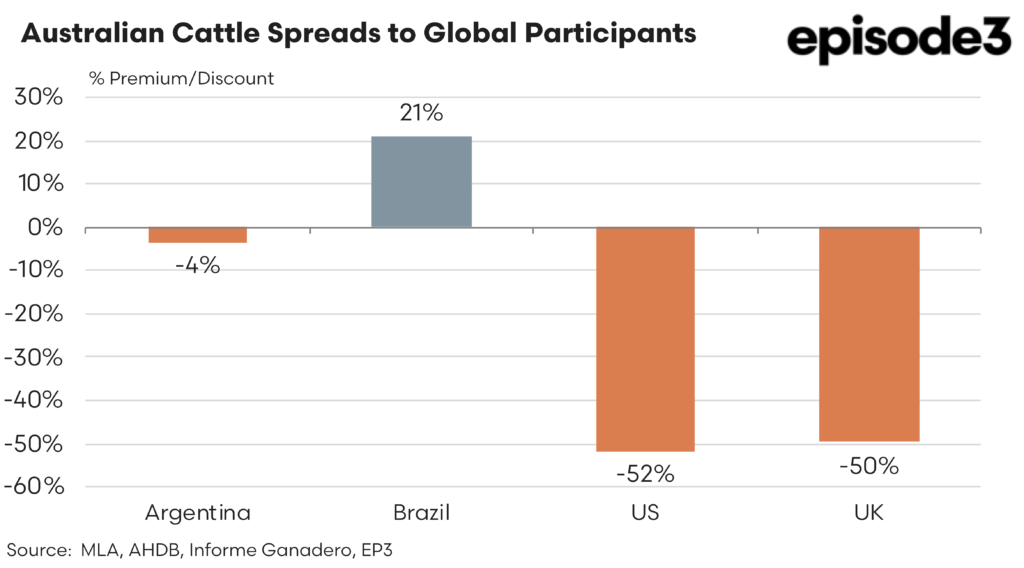 Australian cattle are currently trading at a significant discount to their US and UK counterparts, on par with Argentina and only marginally higher than Brazilian suppliers compared to recent historic trends. These price differentials, and how they align with market access and segmentation, reveal both challenges and opportunities for the Australian beef sector.