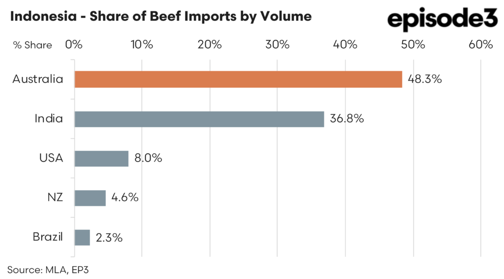 Indonesia is another important market, especially for northern Australian producers. Australia holds nearly half the market share in Indonesia, with India supplying around 37 per cent and the US, Brazil and New Zealand sharing the remainder. Indian buffalo meat is dominant in the low-cost frozen beef segment, particularly for wet markets and foodservice applications.
