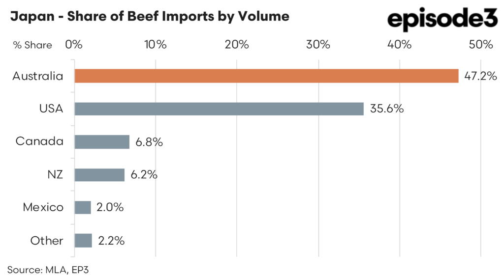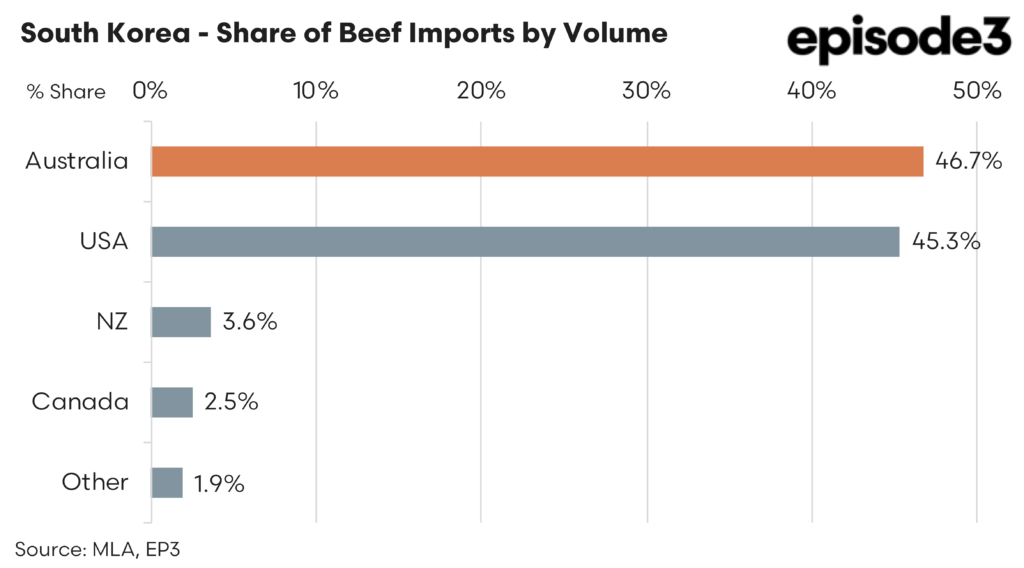 South Korea presents a more evenly split competitive landscape. Australia and the United States each hold around 45 per cent of the Korean beef import market, with New Zealand, Canada and others making up the balance. Korea is highly sensitive to both price and supply continuity, and the Australia–Korea Free Trade Agreement provides a strong basis for trade.