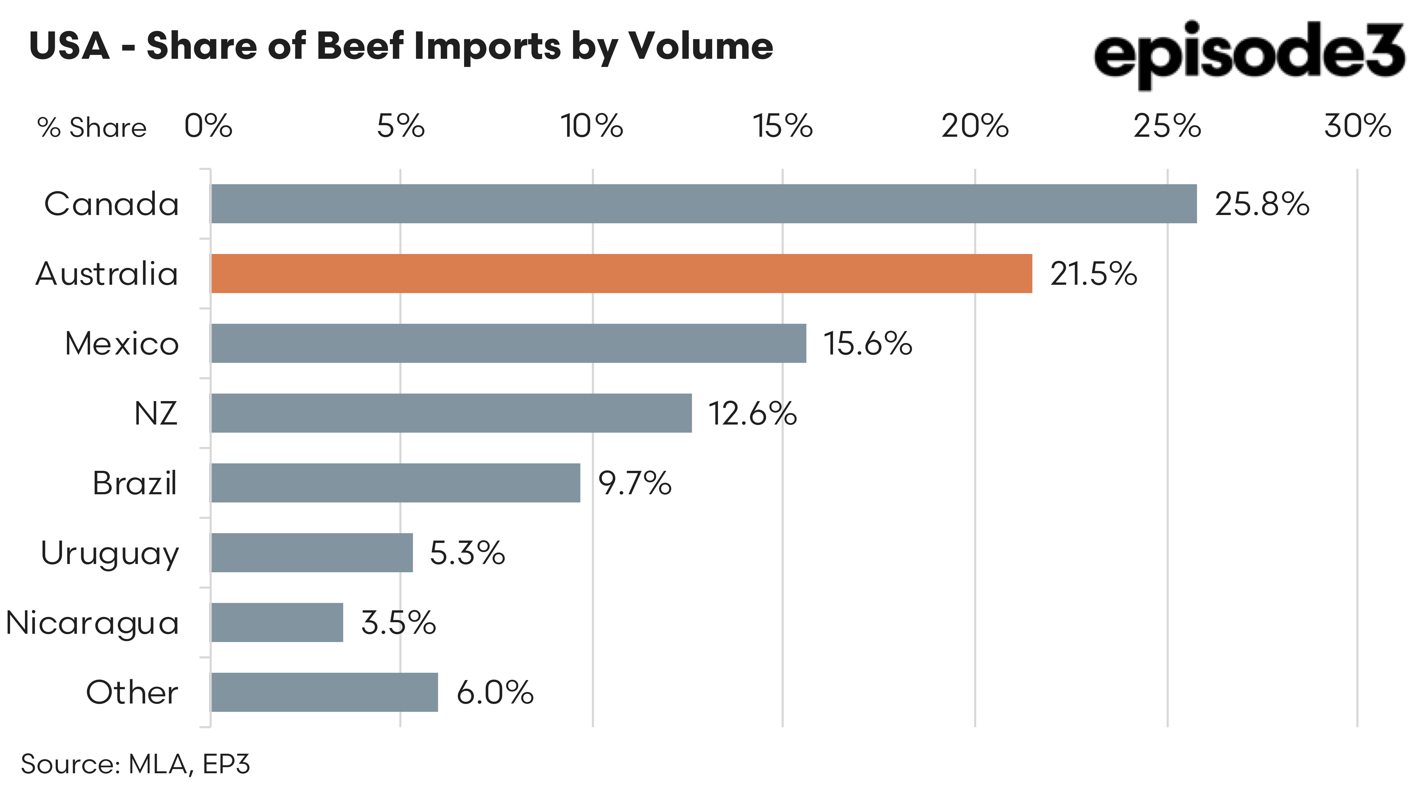 In the US market, Australia is one of many suppliers, with Canada holding the largest share by volume at 26 per cent. Australia’s share is currently just over 21 per cent, with Mexico, New Zealand and South American exporters also present. The US market is unique in that it often requires lean manufacturing beef to blend with domestic fat trim, particularly in hamburger production. Australia has historically been a key supplier to meet this need.