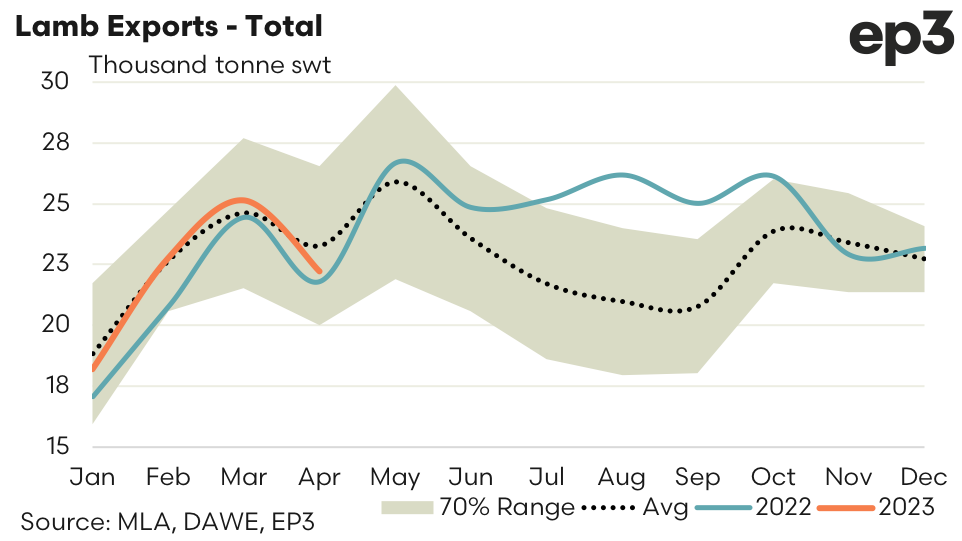 The April 2023 lamb export levels are nearly 5% under the five-year average for April and most of the season has seen the export trend mostly mirroring the average pattern pretty closely.
