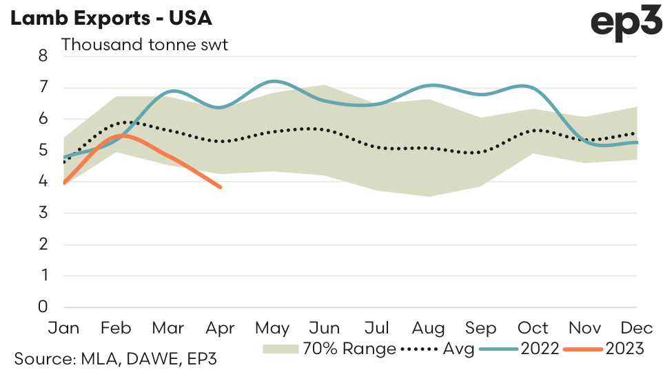 - USA – demand for Aussie lamb continued to head south, declining nearly 21% over April to 3,835 tonnes swt. Consumer sentiment in the USA remains in the doldrums as people fear a looming recession and reduced job security. Aussie lamb is mainly consumed in the food service sector in the USA, so lower numbers going out to eat at a fancy restaurant translates to weaker demand for export lamb. The current US lamb export demand from Australia sits 27% under the five-year average for April.