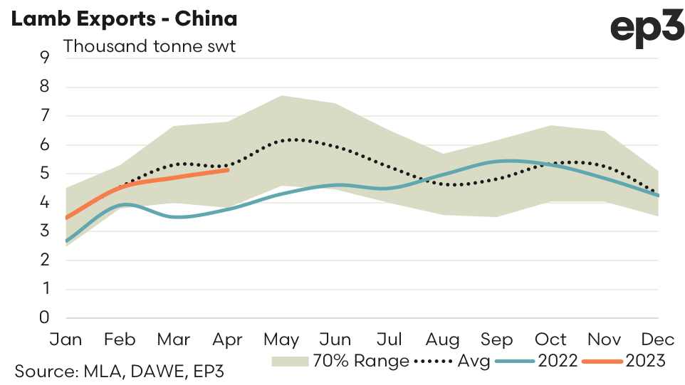 - China – saw lamb export volumes gain nearly 6% over April to see 5,137 tonnes shipped. This represents levels that are just 3% under the seasonal average trend for April.