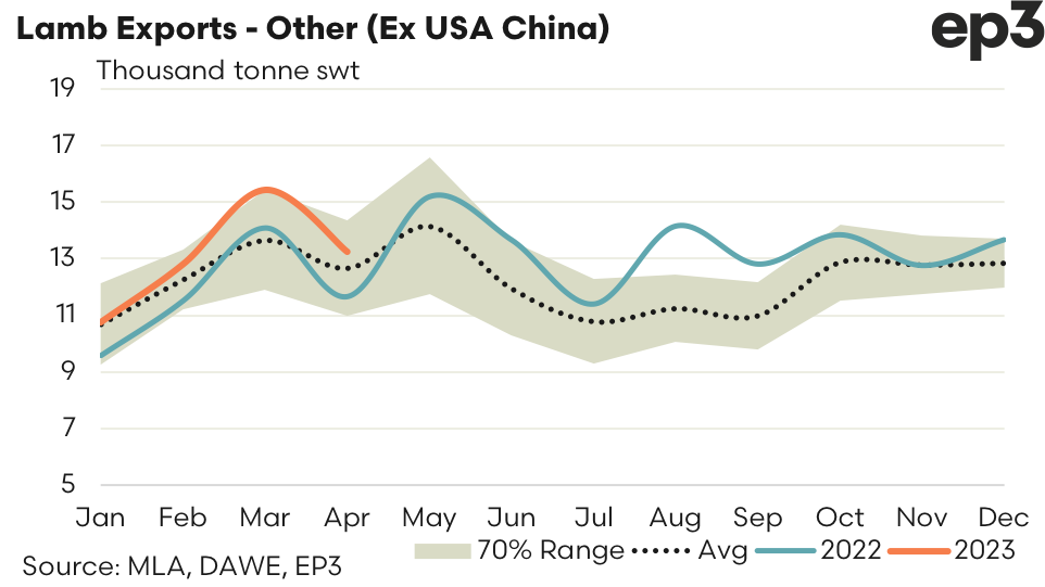 - Trade to all other destinations (excluding China & the USA) remained 5% above the April average at 13,251 tonnes swt, despite a 14% decline in volumes from the levels seen exported in March 2023.