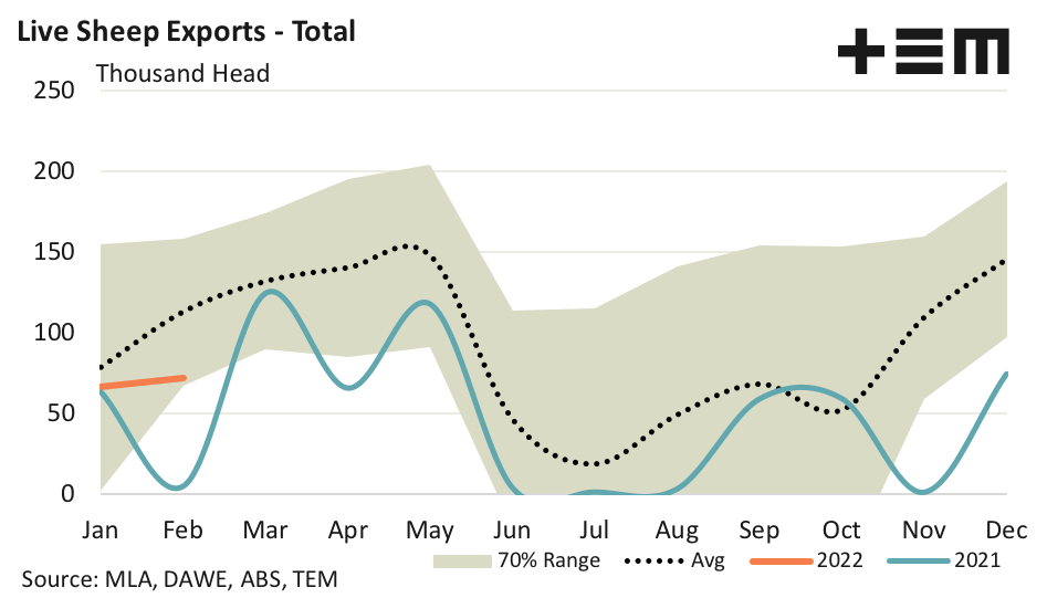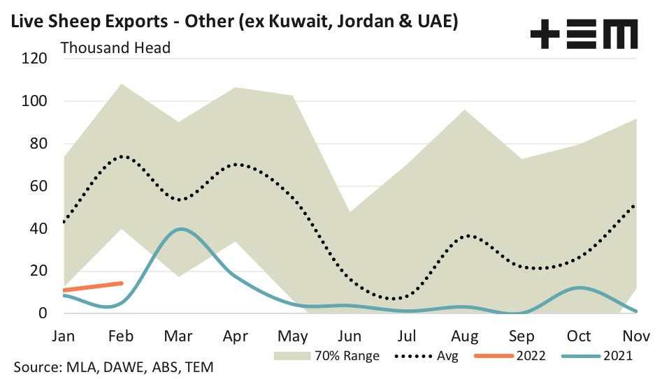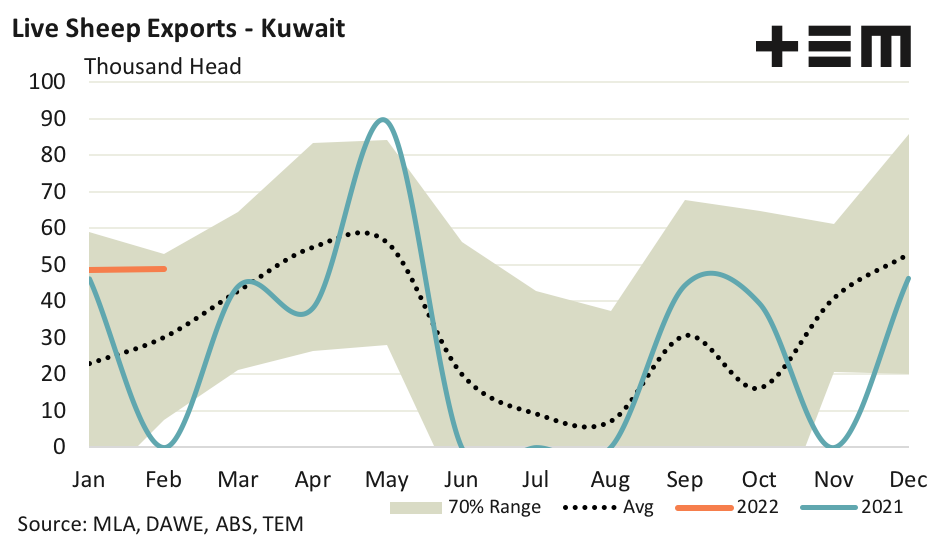 The seasonal picture for sheep exports to Kuwait show a relatively stable start to the season. January saw 48,718 head transported and February has recorded a marginal lift to 48,850 head of sheep. Live export trade volumes since the start of 2022 to Kuwait are running 83% above the five-year average pattern for the first two months of the year.