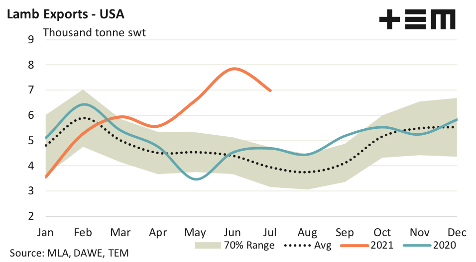 A key driver of the robust demand for Aussie lamb exports is coming from the USA. Despite registering an 11% dip in flows from June to July the current monthly lamb trade figures came in at 6,987 tonnes swt, which are levels that are 77% higher than the five-year July average, according to the seasonal average trend.