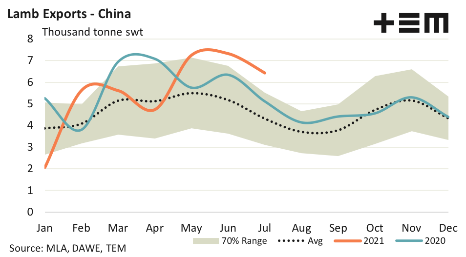 - Lamb export flows to the USA and China in July were 77% and 49% above their respective seasonal average trends.