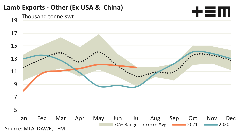 - Meanwhile, lamb export volumes for the remaining destinations (ex USA and China) registered levels that were a comfortable 14% above the five-year average for July.