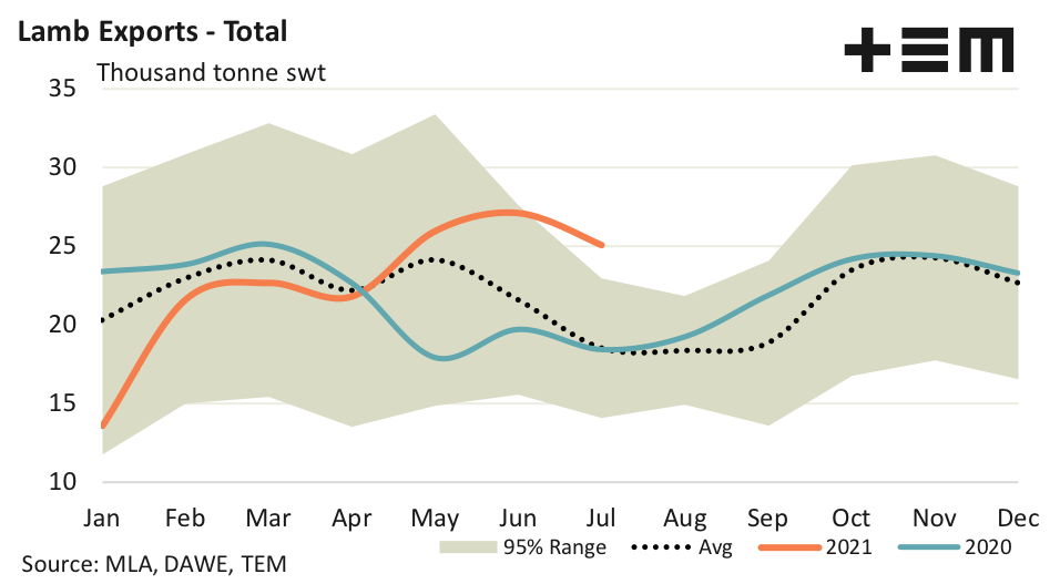 - Total Australian lamb export volumes for July eased nearly 8% over July to 25,066 tonnes, but managed to record levels that were 35% higher than the five-year average for July.