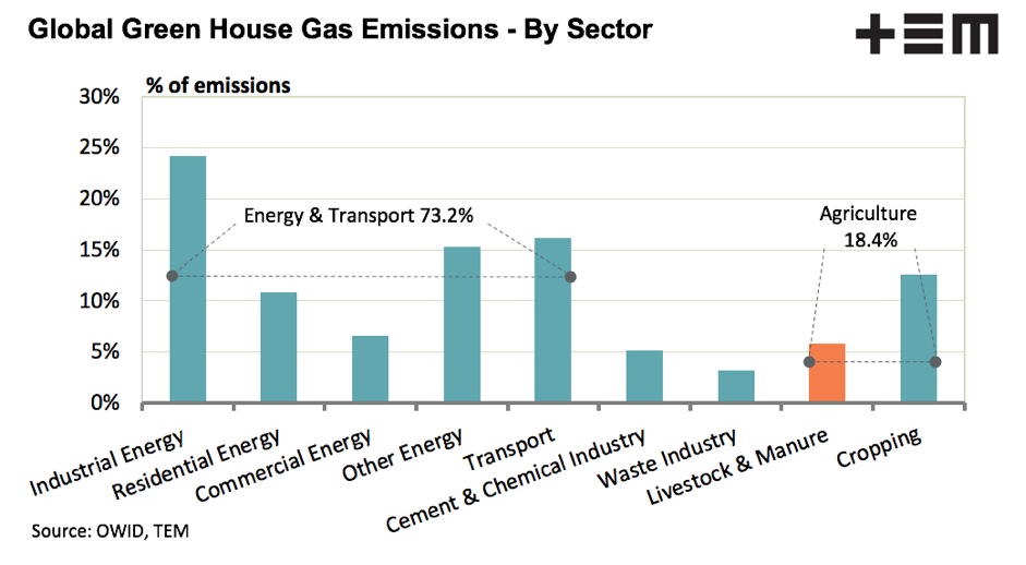 Meanwhile, agriculture and forestry practices accounted for 18.4% of total emissions, which were predominantly a 60/40 per cent mix of methane versus carbon-based emissions. Interestingly, the livestock component of the emissions ledger accounted for just 5.8% of total global emissions, of which 95% was methane-based.