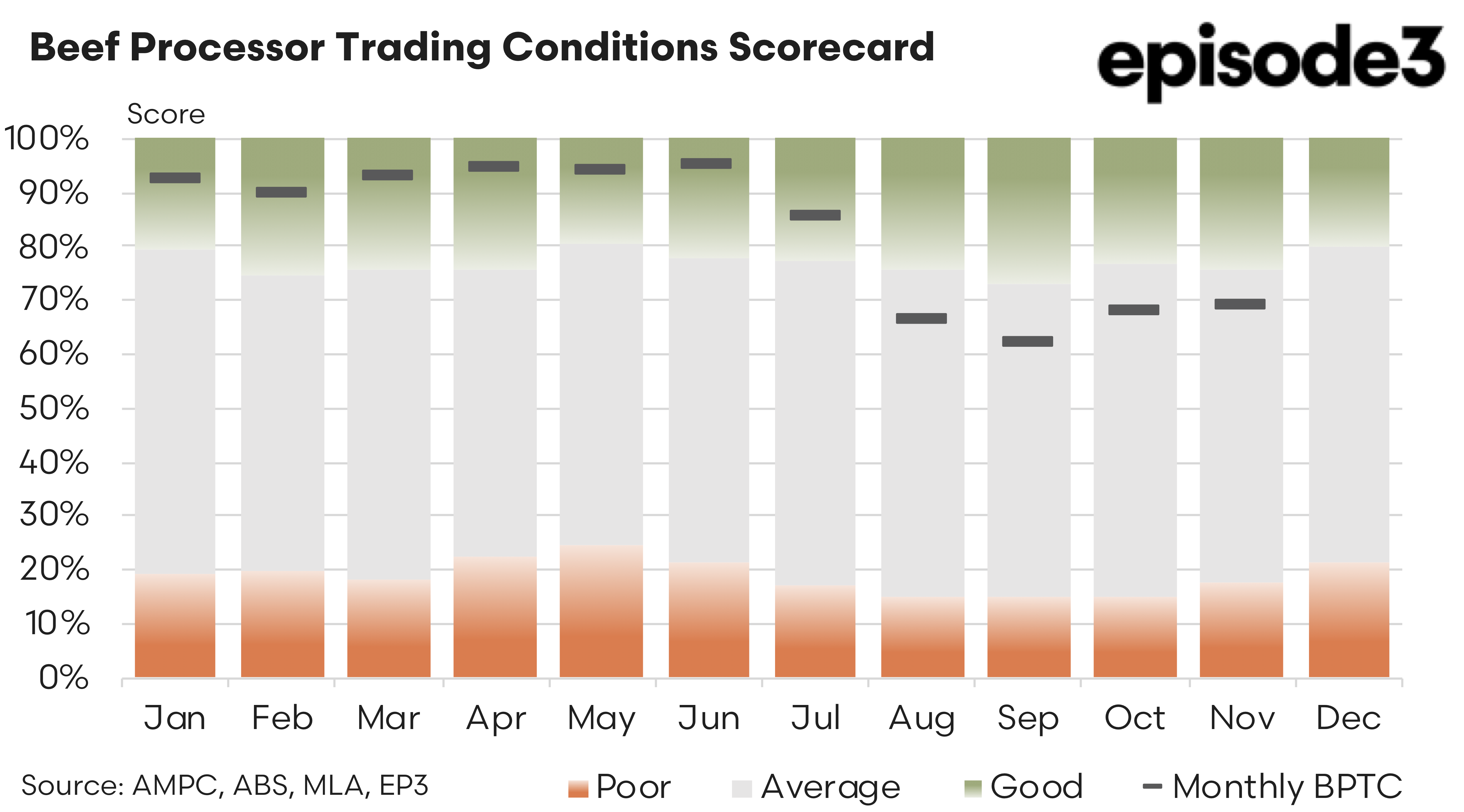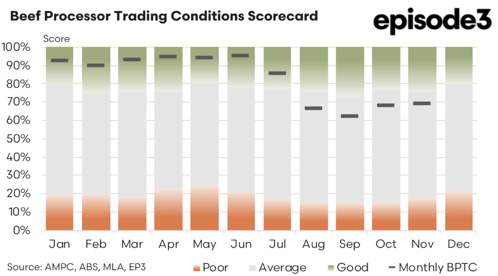 Despite the headwinds, the beef processor trading index edged up to 69% in November, marking a slight improvement over October. This increase, though marginal, reflects the sector’s resilience and ability to navigate a challenging landscape. The modest uplift underscores the importance of managing multiple variables effectively, from input costs to export performance and operational efficiency.