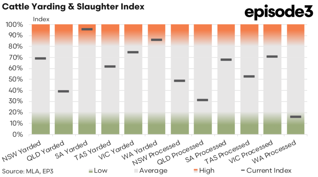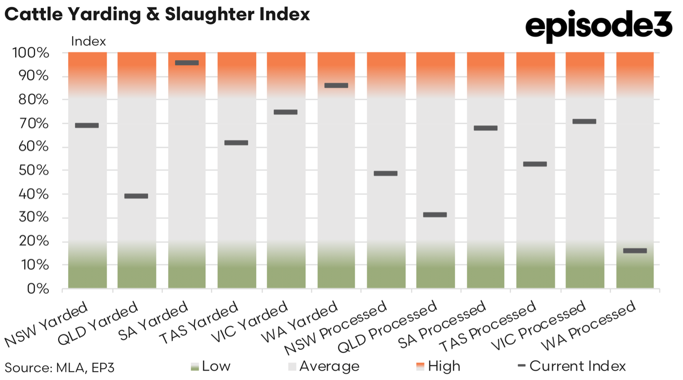 South Australia saw a significant increase in yarding from 85% to 95%, while processing volumes edged up from 66% to 68%. The high yarding levels in SA have been instrumental in supporting both local processing needs and the overflow demand from Queensland. Tasmania, on the other hand, experienced a decline in yarding from 67% to 61% and a drop in processing from 57% to 52%, reflecting a more subdued return compared to other states.